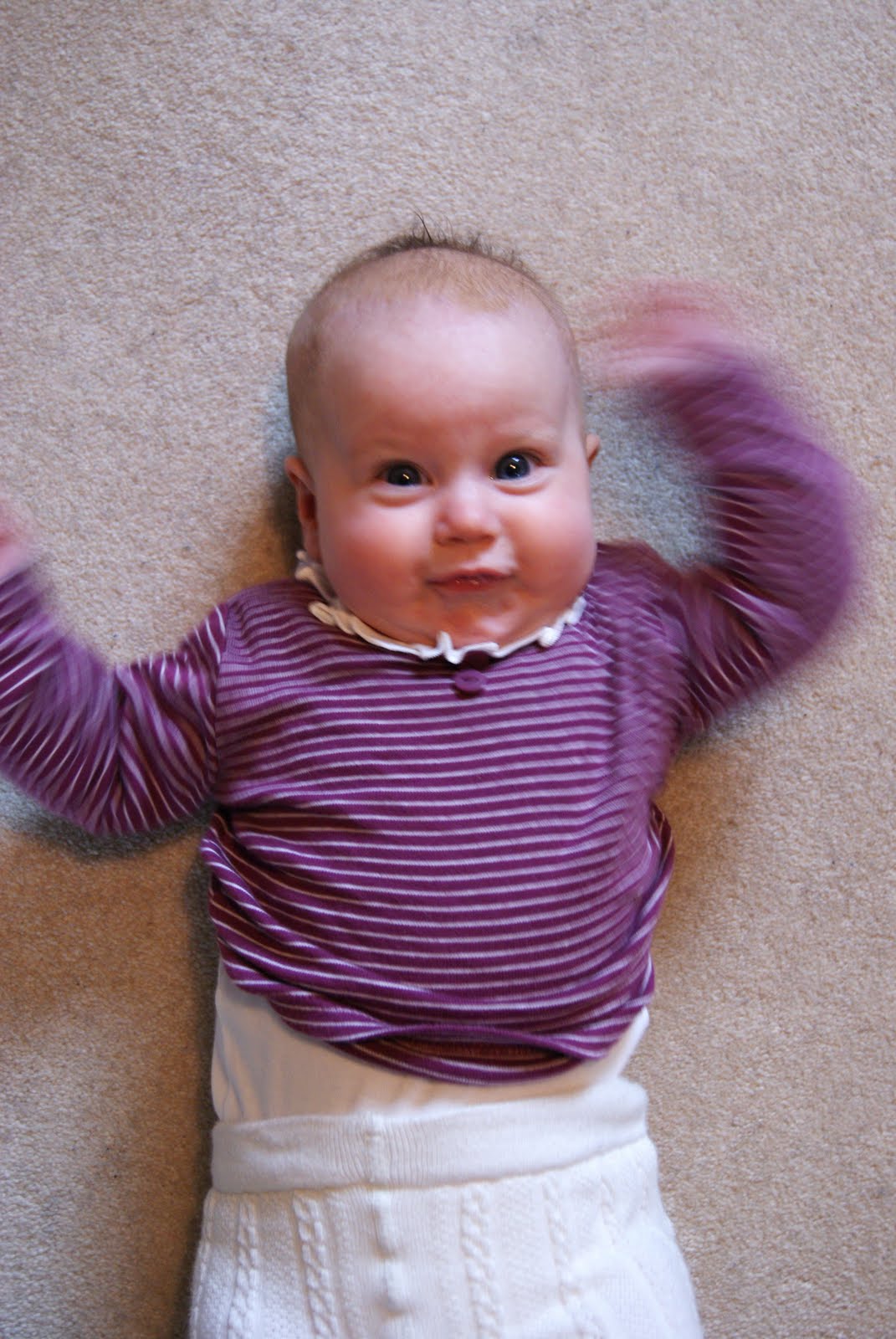Hon greppar tag i allt som flyger förbi henne och plockar upp saker med händerna.Hon är mycket mindre och "mer svag" än vad L var i samma ålder.Mycket mer bebis liksom.När han var fyra månader så stod han upp redan med lite stöd under armarna hahaha.Super-bebben ;-)..